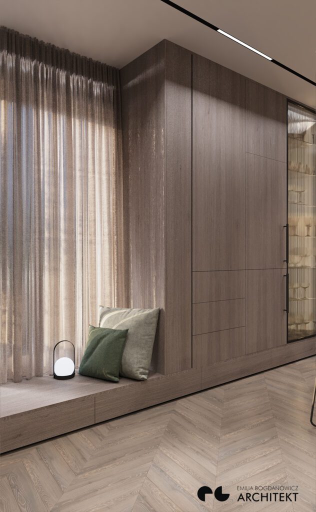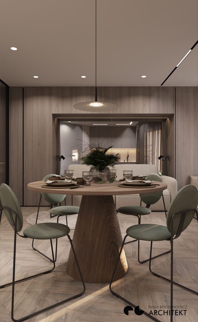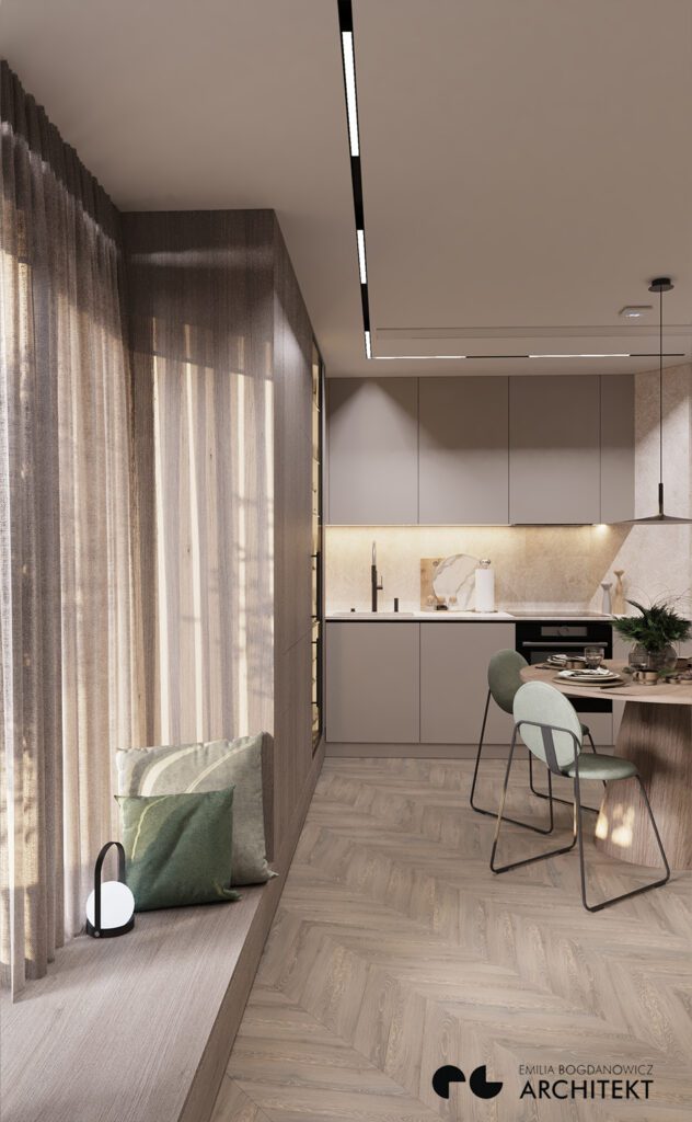 We wnętrzu dominuje naturalna paleta barw – beże, ciepłe szarości, delikatne brązy i akcenty w kolorze czerni. Meble z jasnego drewna, niskie formy, miękkie tkaniny i subtelne detale tworzą przestrzeń, która sprzyja wyciszeniu i koncentracji. Styl Japandi idealnie wpisuje się w potrzeby nowoczesnego singla – łączy estetykę z codzienną praktycznością.