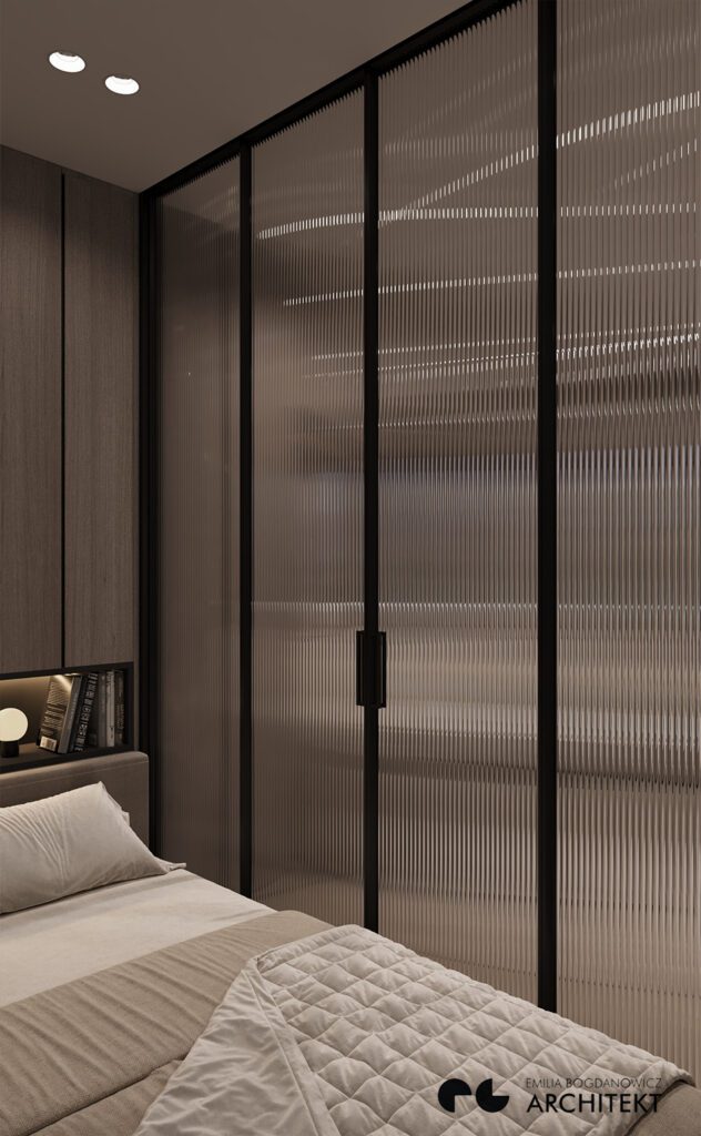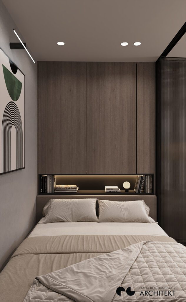 Choć układ mieszkania odbiega od klasycznego prostokąta, dzięki przemyślanej aranżacji udało się uzyskać w pełni ustawną kawalerkę. Zastosowanie zabudowy na wymiar oraz podziału przestrzeni sprawiło, że każdy metr kwadratowy został wykorzystany maksymalnie efektywnie – bez wrażenia przeładowania.