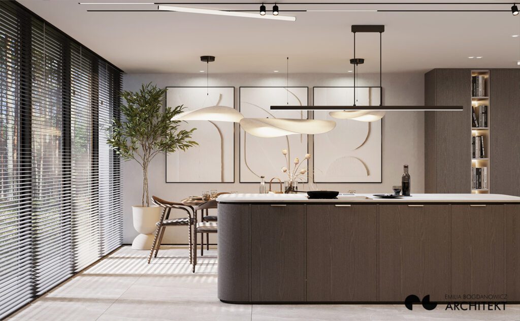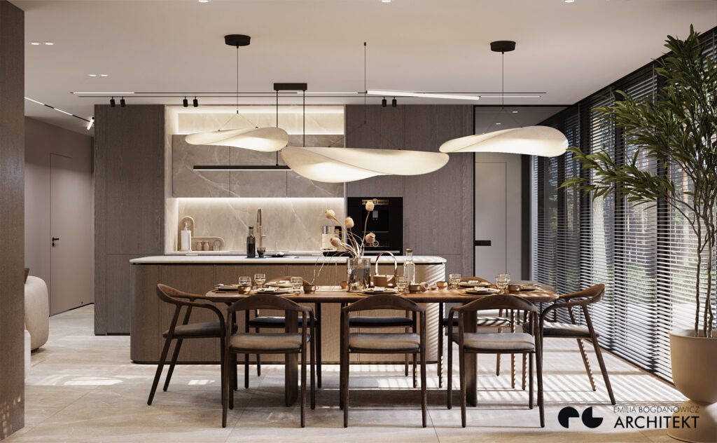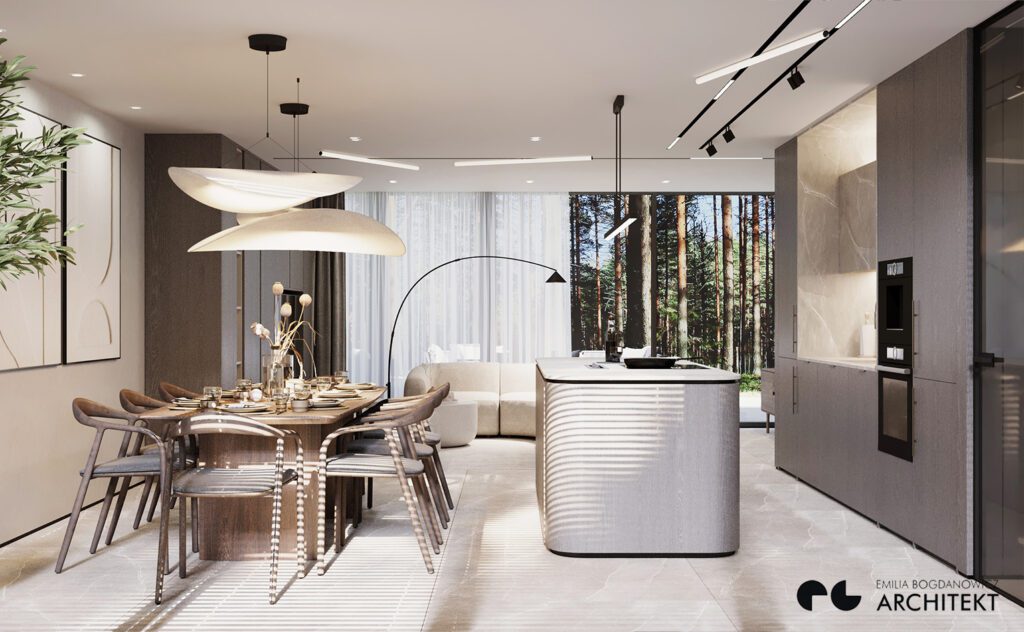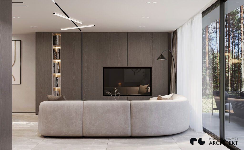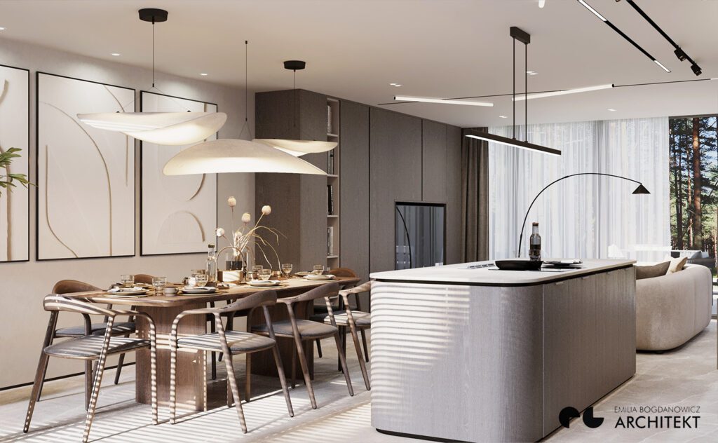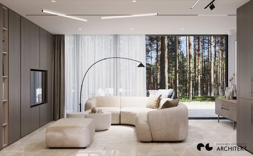 Projekt łączy nowoczesne podejście do przestrzeni z materiałami inspirowanymi naturą. Matowe wykończenia, faktury drewna, len i bawełna, a także stonowane dodatki tworzą wnętrze pełne lekkości, w którym łatwo się zrelaksować i odetchnąć od zgiełku codzienności. Ogromne, wyeksponowane okna wpuszczają do wnętrza mnóstwo naturalnego światła, co sprzyja relaksowi.