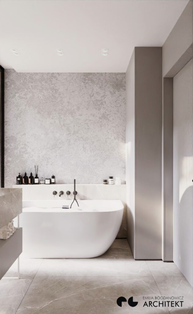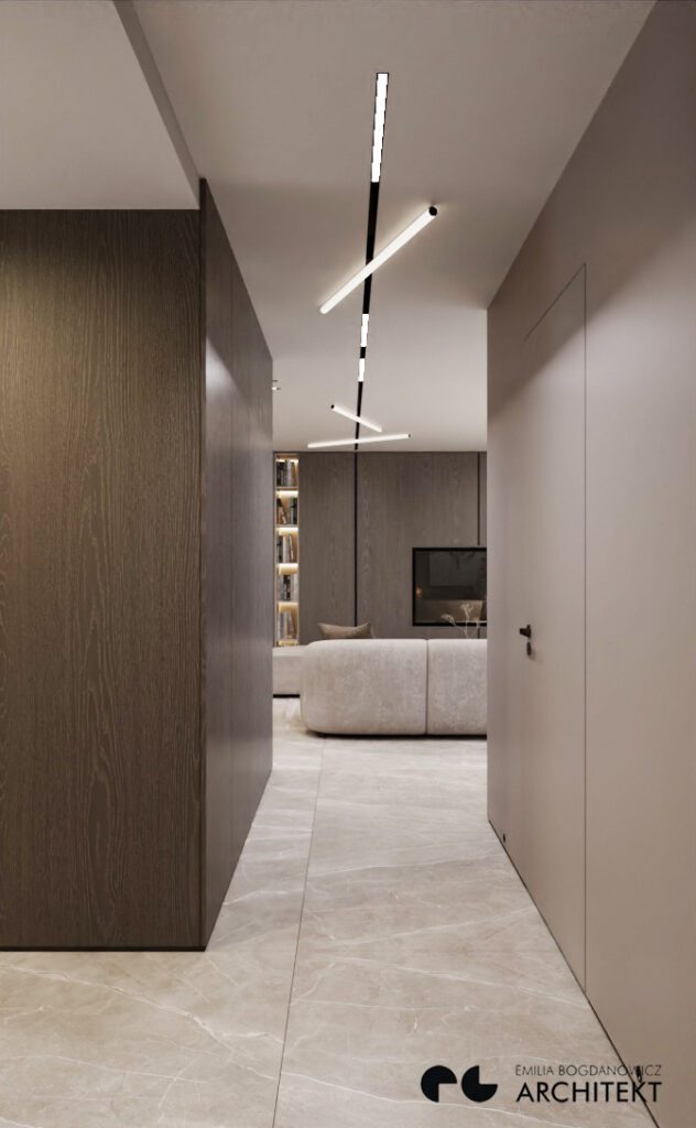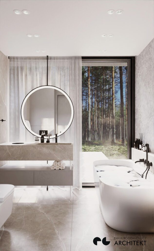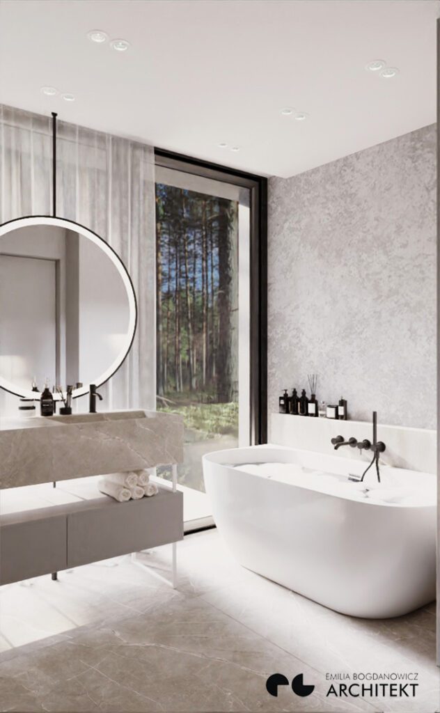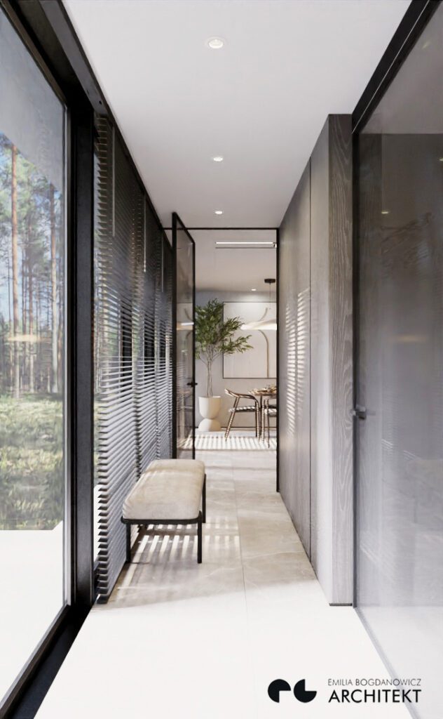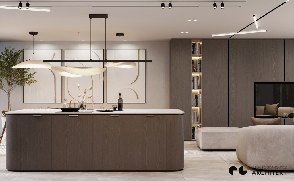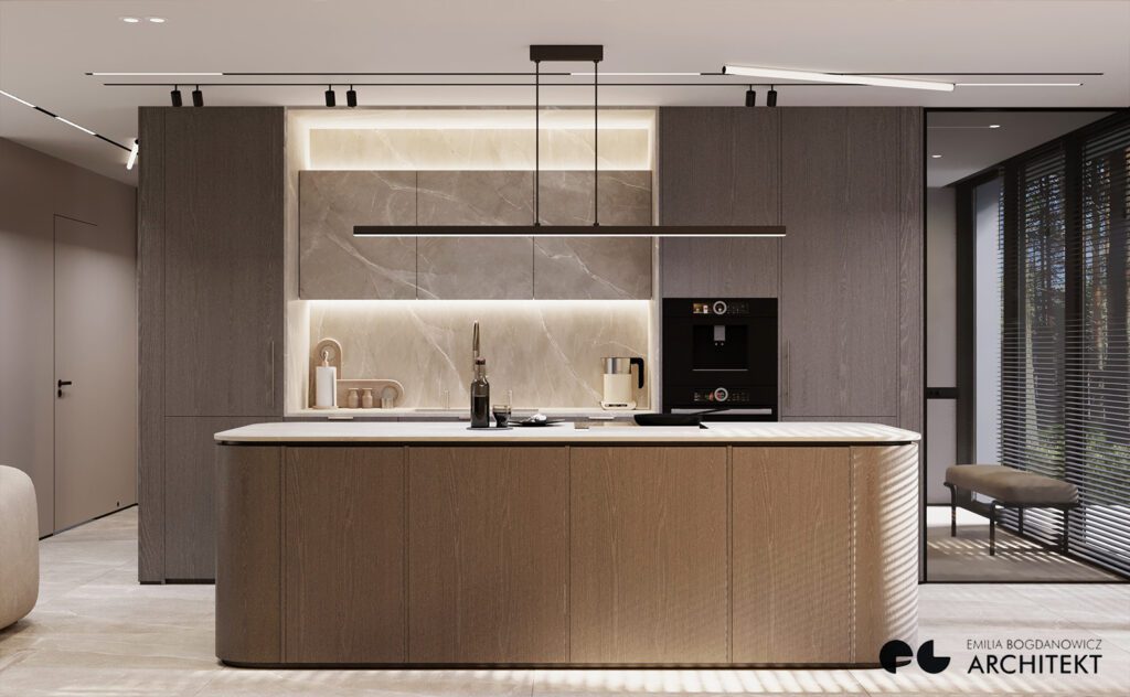 Projekt łączy nowoczesne podejście do przestrzeni z materiałami inspirowanymi naturą. Matowe wykończenia, faktury drewna, len i bawełna, a także stonowane dodatki tworzą wnętrze pełne lekkości, w którym łatwo się zrelaksować i odetchnąć od zgiełku codzienności. Ogromne, wyeksponowane okna wpuszczają do wnętrza mnóstwo naturalnego światła, co sprzyja relaksowi.