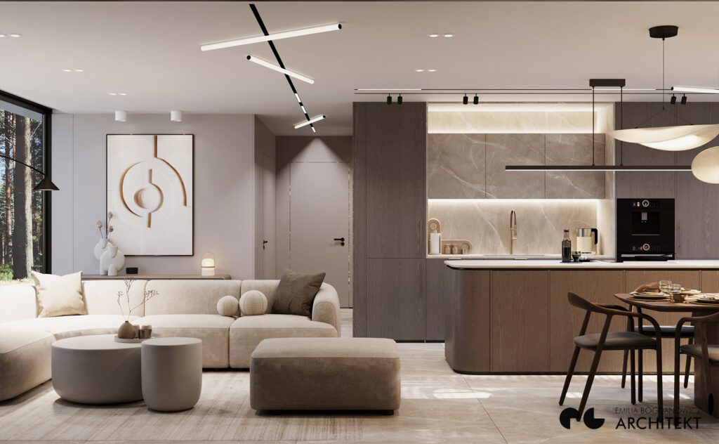 Wnętrze domu modułowego nie musi być surowe ani tymczasowe, ale może być przytulne, przemyślane i pełne harmonii. W tym projekcie postawiliśmy na naturalną paletę beży, by stworzyć przestrzeń sprzyjającą codziennemu komfortowi i wewnętrznemu wyciszeniu. Minimalizm idzie tu w parze z ciepłem, a funkcjonalność z estetyką inspirowaną naturą.